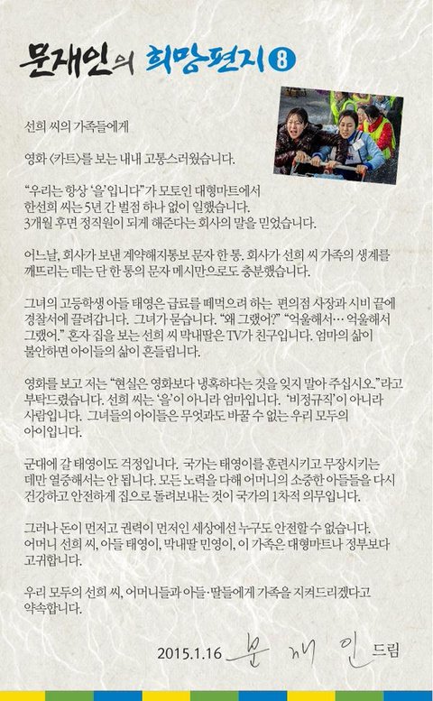 문재인님이 카트의 선희가족에게 보낸 편지