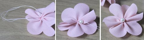 2. 진주 (5mm)한알을 끼워넣고 바늘을 다시 뒷편으로 넣어