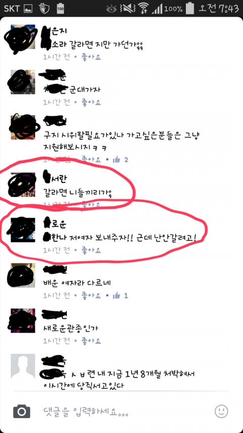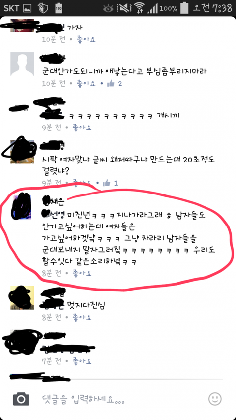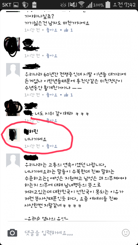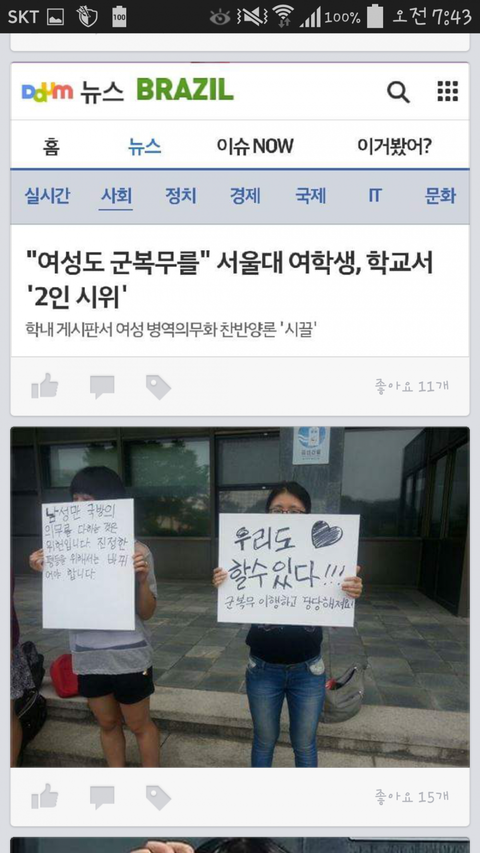 좋아.나라에서 가라고 하면 나도 갈께.근데 저기 나라는 남자여자 모두 평등한게 많지?우니나라는?생리휴가라는 이상한거 만들어놓고 남녀평등?내가 원하는건 그게 아니야.여자도 정직원으로 뽑히는게 평등하게 되야하고,결혼하면 육아휴직도 제대로 보장해줘야해.물론 남자에게도 육아휴직을 보장해줘야하고.사회적인것에는 여자가 차별받는것도 많아.그러니깐 천천히 서로서로 배려하며 맞추는거지.누가 더 뭐했네 그런문제가 아니라고.