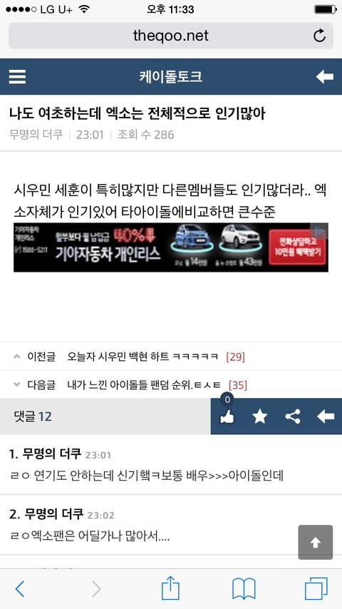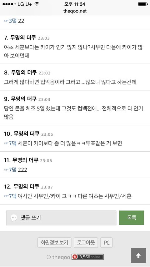 이글뿐 아니라 여초인기하면 거의 시우민 세훈 얘기해ㅋㅋ딱 한명만 카이 얘기함ㅋㅋㅋ카이 역전한지가 언제인뎈ㅋㅋㅋ세훈 인기 왜이리 늘었냐고 글 많았어ㅋㅋㅋ여시랑 판만 조금 느리지ㅋㅋㅋ솔까 여시도 요즘 순위 모름ㅋㅋㅋ