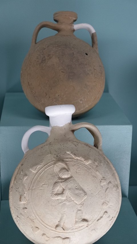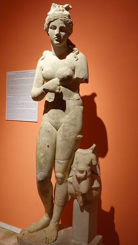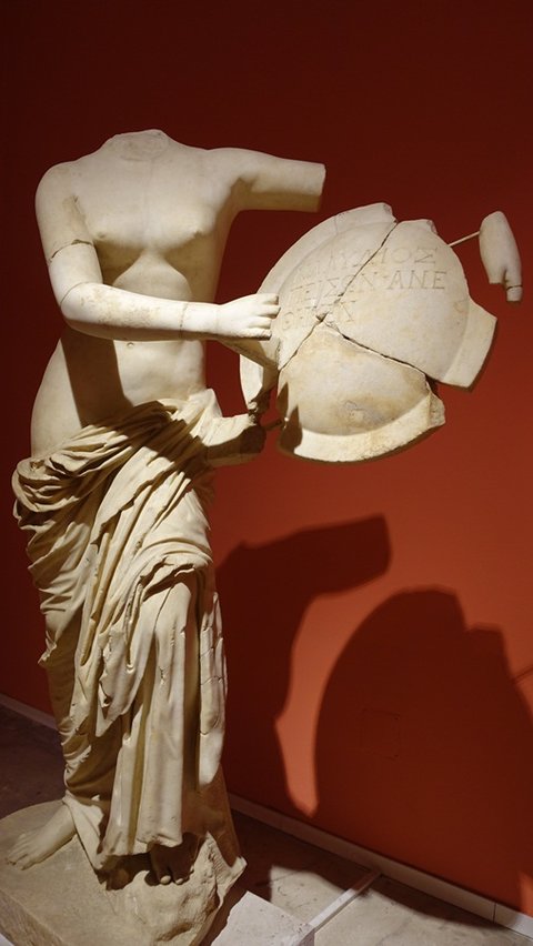 방패를 쥐고 있는 아프로디테상. 방패의 문구는 조각상 제작을 후원한 사람의 이름.