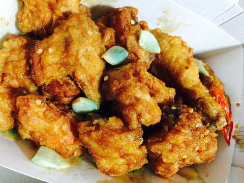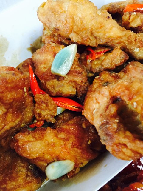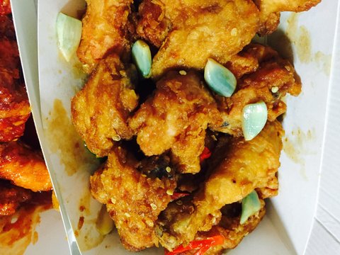 마늘치킨은 사진에서처럼 파랗게 색이 들어있었음.