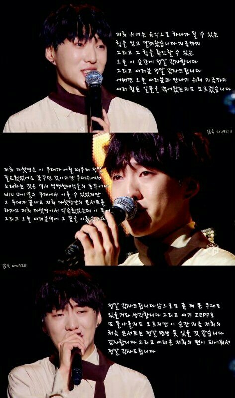 1.빅뱅 태양:저는 여러분들이 꼭 저희 빅뱅의 음악이 아니라도 이 세상에 존재하는 많은 좋은 음악들을 듣고 행복하셨으면 좋겠어요. 그게 제가 노래하고 무대에 서는 이유니깐요.