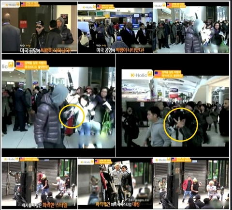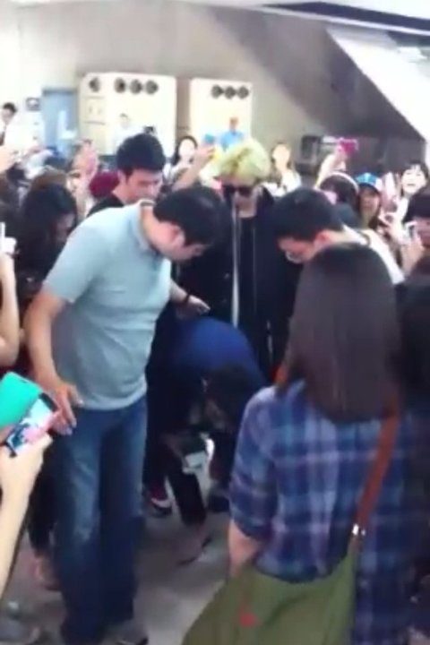 왼쪽이 매니저고, 오른쪽이 지디인가봐. 그런데 팬이 공항에서 지디한테 팬레터 주려다가 넘어졌나봄. 근데 솔직히 공항에서 정신없는 상황에서 뛰어오고 넘어지고 그러면 잘 모르잖아, 특히 가수들은.