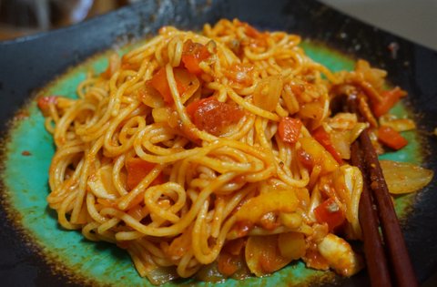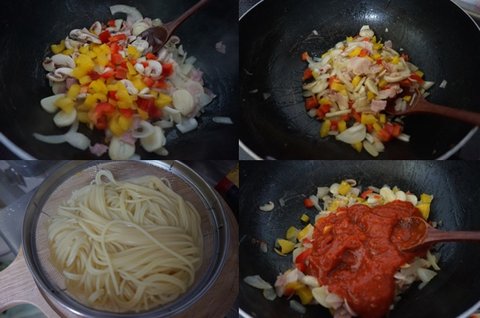 그리고 잘 삶아진 면과 파스타 소스 투하