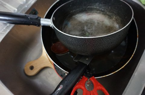 가스레인지 한쪽에는 면을 삶고, 한쪽에서는 야채를 볶는데요