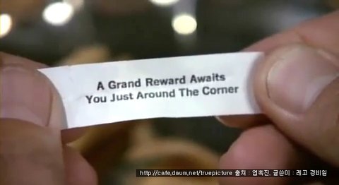 포춘 쿠키의 점괘를 읽어보는 남자. "골목길을 돌아설 때, 엄청난 보상이 기다리고 있다."??