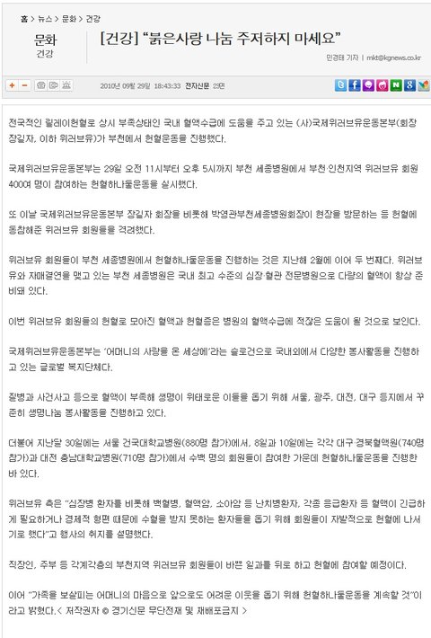 전국적인 헌혈릴레이운동 국제위러브유운동본부(회장장길자) 헌혈하나둘운동