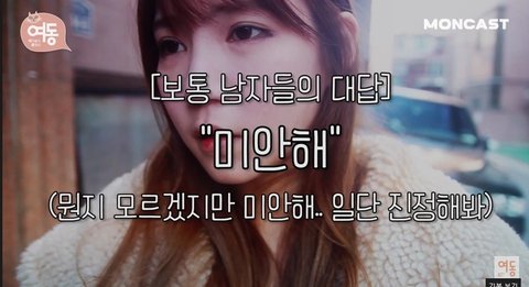 ㅋㅋㅋ 아 근데 나도 저런거 극혐이었는데, 싸우니까 열에 한번은 어쩔 수 없이 저렇게 되더라ㅜㅜ... 왜냐면 남친이 주구장창 미안하다는 말밖에 안할때가 있거든.. 결국 뭐가 미안한데? 하고 묻게 되잖음;; 그럼 이거이거해서 미안하다, 하면 결국 내 입에선 아는 사람이 왜 미안할 일을 해! 로 나오게 되더라-_-;; 여기서 남친이 사과해야하는 포인트가 틀리면 여자 입에선 내가 왜 화내는지도 모르면서 사과하는거야? 그냥 이 상황을 넘기려고? 됐어 나 집에갈래! 가 되는거 같음ㄷㄷㄷ