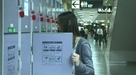 여자는 가방을 넣을려고 사물함을 엽니다