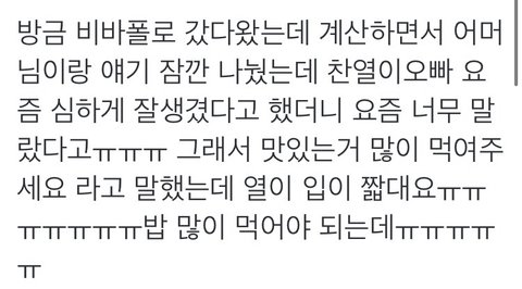 찬열이 너무 말랐대ㅜㅜ 포옹해줘야 들어온다니 너무 사랑스러워 사랑둥이.. 매일 포옹해주고 싶다 밥 많이 먹구 다녀 찬열아ㅜㅜ