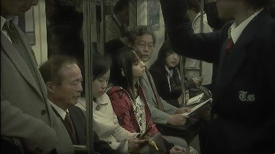 사람많은 지하철안에서 시끄럽게 음악을 듣고 있는 여자