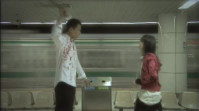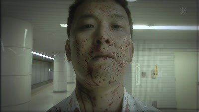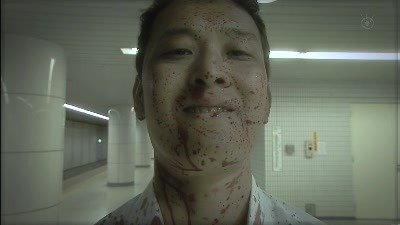 피가 묻어있는 얼굴로 여자보고 씩 웃네요