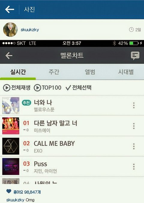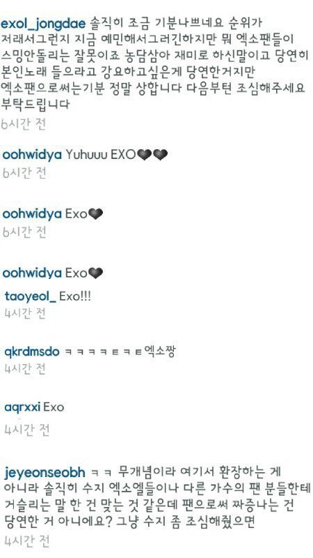 걍 자기들 노래 1위 하니까 기분 좋아서 캡쳐글 올렷는데 엑소팬들 갑자기 와서 비매너 운운하면 인신공격으로 테러질 함. 지네 오빠 노래 1위 못해서 수지한태 화풀이 하는거 같음