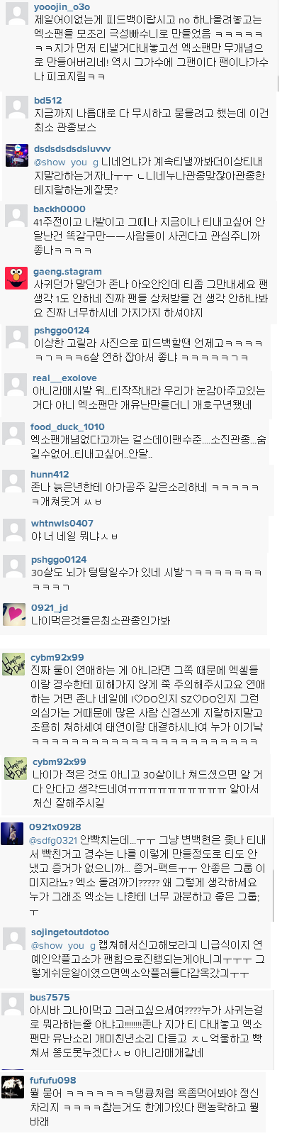 이렇게 반성은 커녕 맨날 소수드립에 매번 다른 가수들 까고 sns가서 테러하고 하면서 일부를 전체를 매도하지 말라고 하니까 아이돌 팬덤들 대부분이 엑소팬들이라면 치를 떨고 싫어함. 누가 엑소팬들은 아이돌 팬덤계의 IS라고 하던데 그 말 맞는 거 같음