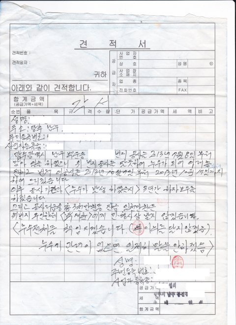 2013년 10월7일부터 2013년 10월17일까지 누수를 다시 재 공사 요청해서 각서 까지 받고