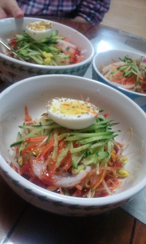 아삭한 콩나물이랑 오이 당근 양파 곱게 채썰어 올리고 새콤달콤매콤 양념장에 비빈 쫄면에 삶은 달걀 반쪽과 고소한 통깨의 조화는 말이 필요없는 메뉴^^