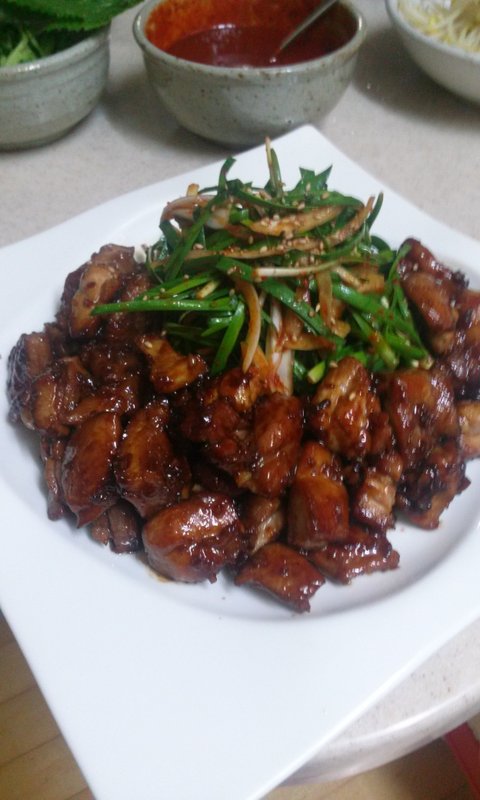 싱싱한 닭다리살에 짭쪼롬하게 양념해서 윤기 좔좔 흐르게 닭불고기 구워내고 새콤하게 무쳐낸 부추겉절이 곁들이면 생각나는건 알콜~~~^^