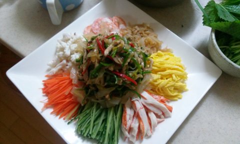 양장피 잡채~야채 채썰고 해물 손질해서 데쳐내고 고기볶음 볶고 양장피 삶아내고 겁나 손 많이 가지만 코 톡 쏘는 겨자소스 뿌려 비비는 순간 노동의 고통은 안녕~~~^^