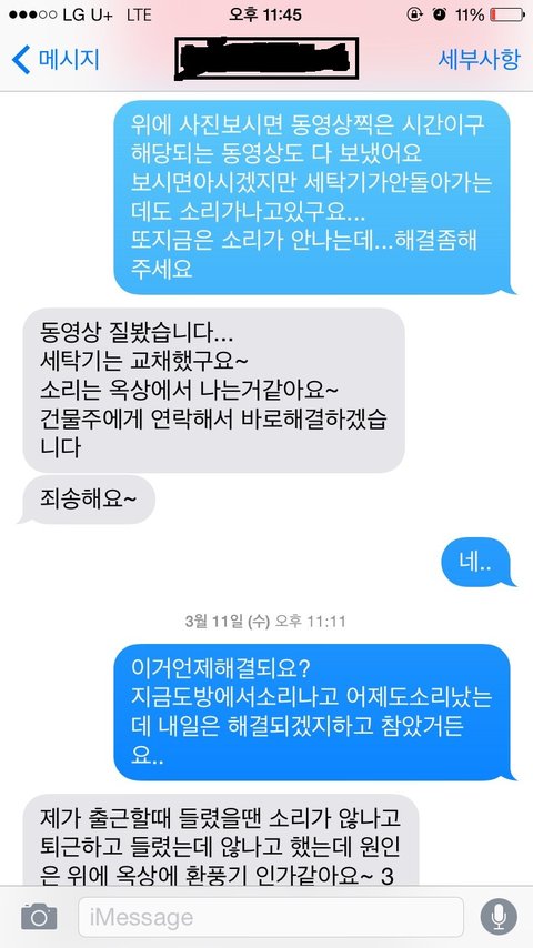 어찌됐던 소음은 계속되었고 제대로 해결을 해주지않아서 9일에 다시 소음을 녹음한 음성메세지들을 보냈고 세탁기 소리라고 계속 주장을 하셨었는데, 새벽에 이 소음때문에 잠에서 깨게되어 세탁기가 있는 곳에 가보니 세탁기는 작동하지 않고있어서 그 모든 과정을 보여주는 동영상도 찍어 보냈습니다.