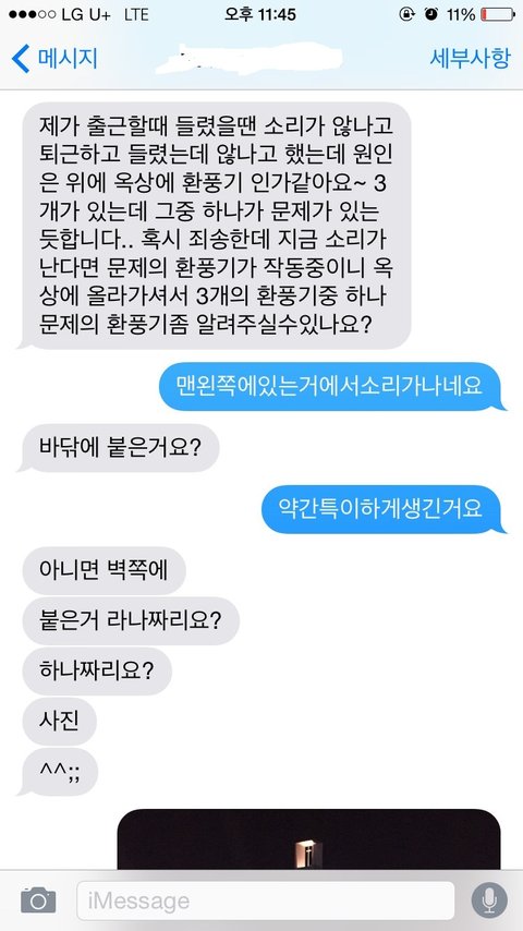 어느 환풍기에서 소리가 나는건지 다시 제게 물어보며 사진을 찍어주길 요구하길래 바쁘기도 바쁘고 이미 저도 약간은 짜증이 난 상태여서 그건 제게 물어볼게 아니라 직접보시는게 맞는것 같다고 답을 했습니다.