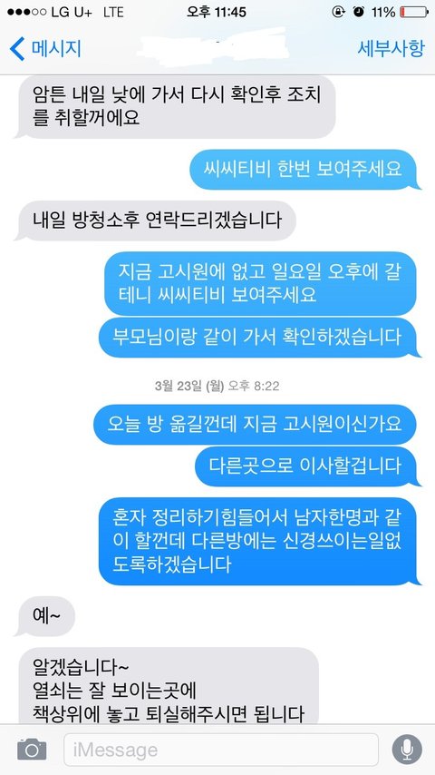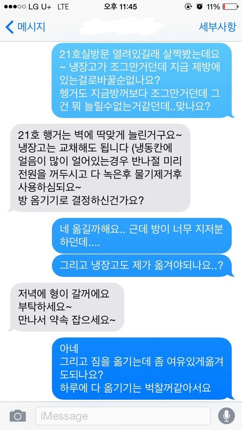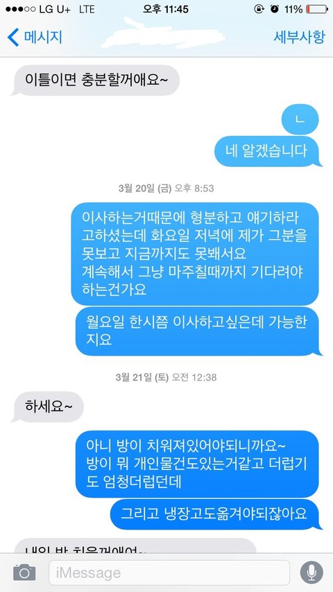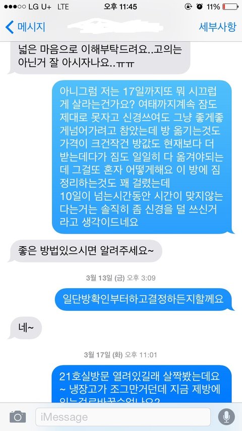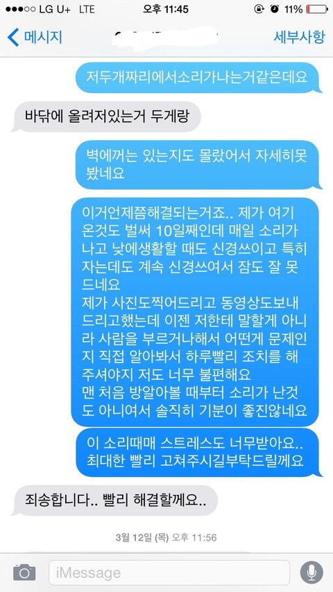저는 입주한 순간부터 십일이 넘도록 잠 한번 편히자지 못하였구요. 기다리다못해 11일에 언제 해결되냐며 다시 연락을 했습니다. (먼저 연락을 한 적이 거의 없었어요 상황이 어떻게 되고 있는지도 한 마디 말도 없어서 거의 제가 계속 먼저 연락을 하면 답장이 오고 그러는 상태였습니다)