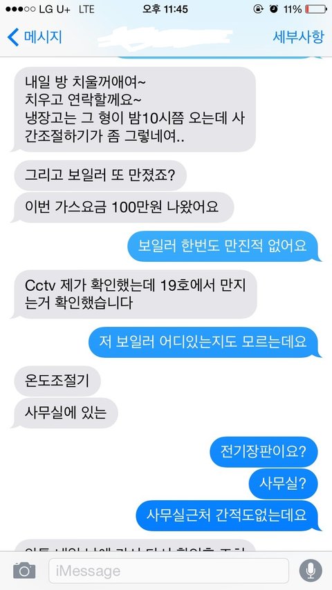 전에 한번 제가 소음의 출처가 보일러인 듯 하여 보일러 소리가 아닌가 싶다고 연락한 적 있었는데 제게 ‘보일러는 건들이지 말라’며 답장이 온적이 있었습니다. 헌데 저는 그때까지 보일러가 어디있는지도 몰랐으며, 그런 문자가 온 후 보일러가 어디있는 거냐며 위치를 물었더니 보일러는 부엌에 있다고해서 소리가 여기서 나는건가해서 그냥 손만 얹은 적이 있었습니다. 해서 그 이야기를 하시나보다 하여 부엌에 있는 보일러를 말씀하시는 거냐고 물었더니 사무실에 있는 온도조절기를 제가 손댔다고 하며 저 때문에 가스요금이 100만원 이나 나온 것처럼 이야기를 하셨습니다.