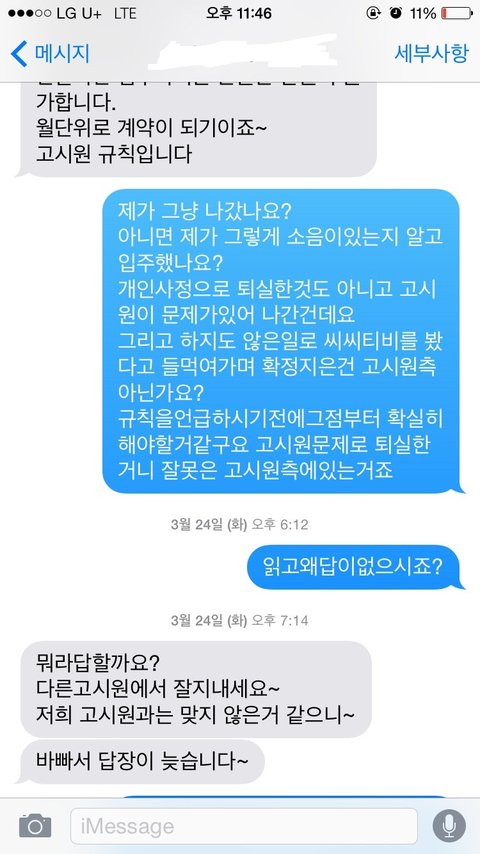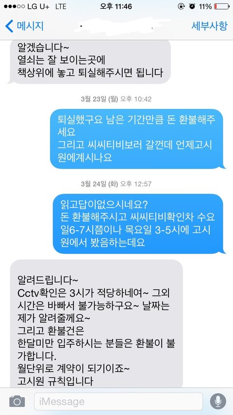소음 때문에 잠들지 못해서 피해보고, 다시 이사를 하고 다시 살 곳을 알아보러 다니는 등 시간적, 정신적 피해를 많이 봤지만 그냥 더 이상 얽히기 싫어 남은 기간만큼의 돈을 환불해 달라하자, 그쪽에서는 문자를 읽고 답장을 하지 않아서 다음날 다시 연락을 드렸더니, 고시원 규칙이 한달 미만 입주하는 분들은 환불이 불가하다, 월단위로 계약이 되는거라 안된다 하며 그제서야 답장을 보냈습니다.