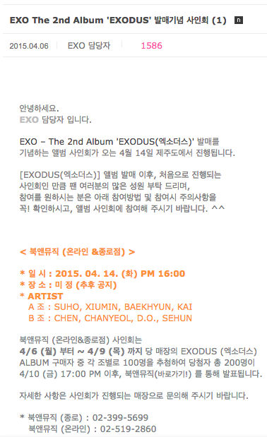 4월 14일 제주도에서 진행됩니다. < 북앤뮤직 (온라인 &종로점) > * 일 시 : 2015.04.14.(화)PM 16:00 * 장 소 : 미 정 (추후 공지) *A 조 : 수호, 시우민, 백현, 카이 B 조 : 첸, 찬열, 디오, 세훈