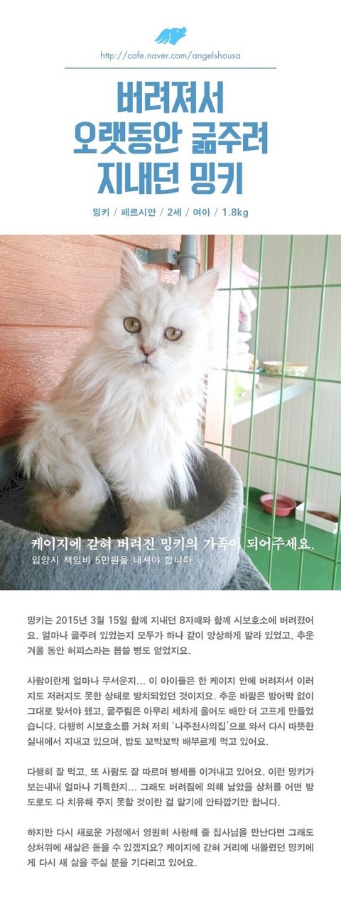 [나주천사의집/페르시안] 케이지에 갇혀 버려져 뼈만 앙상하던 밍키의 가족이 되어주세요.