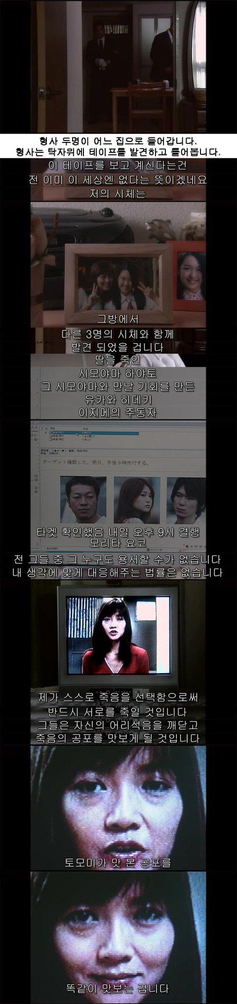 동급생 여자애를 밀실에 갇히게 해서 자신은 자살하고 그들을 서로 죽이게 만든겁니다.