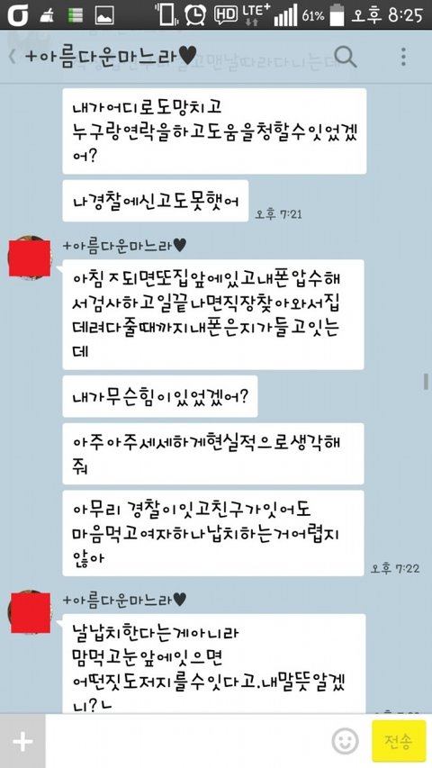 너가 나서면 너도 분명히 다치거나, 그 순간 잠깐만 다신안그러겠다고 할꺼라고 그리고 자기한테 보복할꺼라고.. 그러니 나서지 말고 자기가 통화한번하고 번호도 바꾸고 무시할꺼라고해서