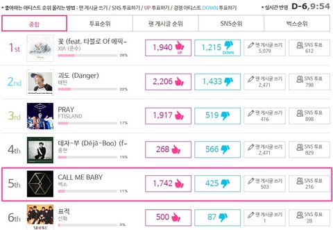 명예의 전당에 콜미베이비도 올려줘야잖아~ 엑소&엑셀 자존심이 있지 5위가 뭐냐ㅜㅜ 콜베up클릭! 경쟁팀3팀 down클릭! 간단한 회원가입으로 아이디당 10개씩 팬게시글 쓰기! 트위터 아이디당 3표씩 투표! 아직 명예의 전당 2관왕이 안 나왔잖아 우리가 최초로 2관왕 시켜주자!!!