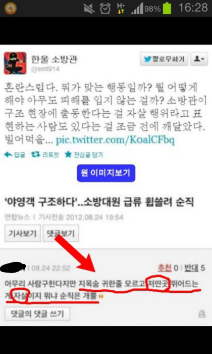 윗놈들만 문제인가?국민 대다수 정신머리가 썩었는데 ㅋㅋ 이글에도 있지만 소방대원을 자기 하인으로 생각하는 사람들 겁나 많음 ㅋㅋ 공짜는 없다는 저년 머리 겁나 쎄게 후리고싶네