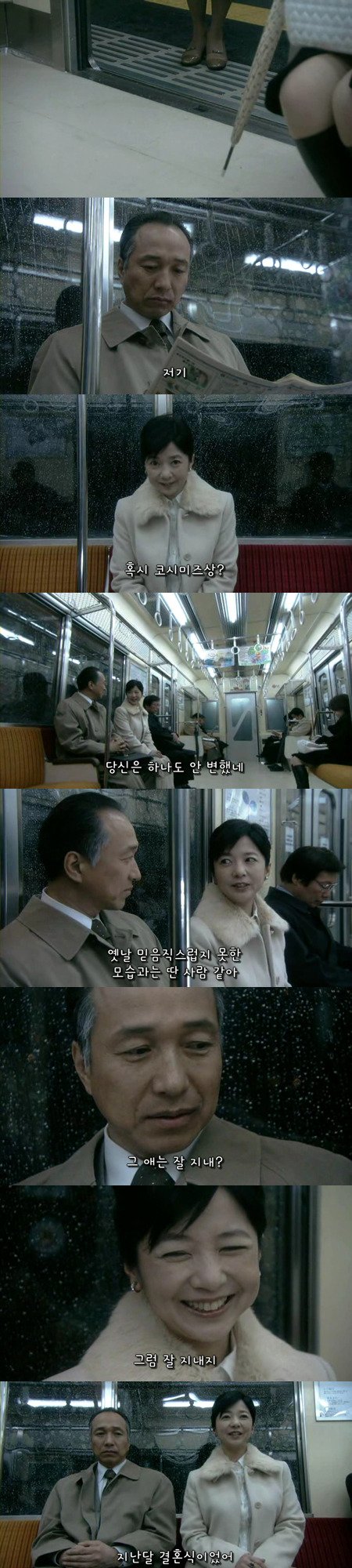 여자가 내릴 역에 도착하고, 두 사람은 다시 그렇게 헤어집니다.