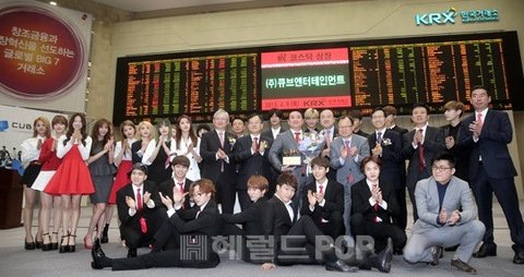 큐브엔터테인먼트는 9일 오전 서울 영등포구 여의도동 한국거래소에서 상장 기념식을 갖고 코스닥 시장 입성의 신호탄을 쏘아 올렸다.