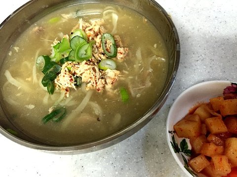 2.닭을 삶은육수와 가슴살찢어 올린 닭칼국수