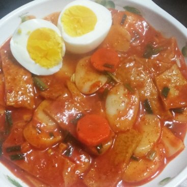 이건 삼색 떡으로 만든 고춧가루 떡볶이이에요