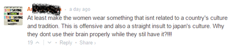최소한 여자들이 입는 옷이 한 나라의 문화와 전통에 관련이 없게 만들어. 이건 불쾌하고, 또 일본 문화에 직접적인 모욕이야. 왜 뇌를 가지고 있으면서 적절하게 쓰려고 하지 않는거야?!!
