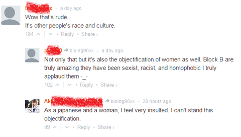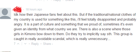 쟤네 일본 팬들이 어떻게 느낄 지 모르겠네. 하지만 내 나라의 전통 옷이 이런 것에 사용된다면, 난 실망할거고 화날거야. 이건 우리가 자랑스럽게 생각하는 문화의 일부잖아, 우리 나라가 무슨 나라인지 정체성을 부여하는 것들이고. 기모노 입은 여자들이 그들(블락비)에게 절하는 장면도 있어. 쟤네는 '뭔가'를 함축적으로 이야기 하려는것 같네. 이 그룹은 정말 피해야할 스캔들에 휘말린거야. 진짜 쓸데없다.