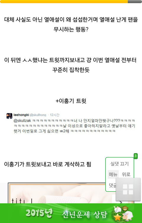 지금 사실도 아닌 열애설에 욕먹고 트윗내용때메 또다시 욕먹는 이홍기.