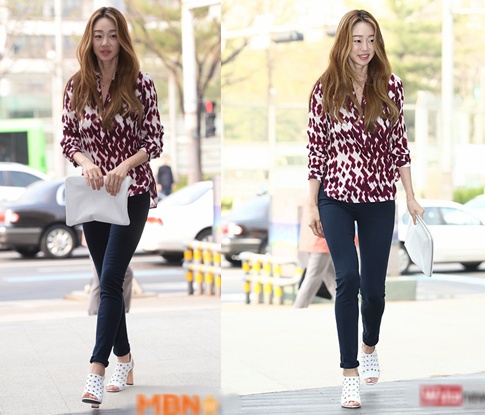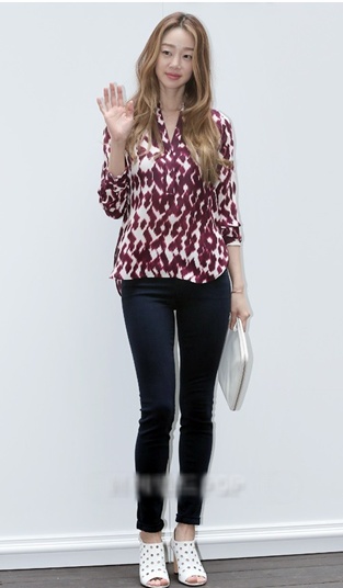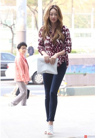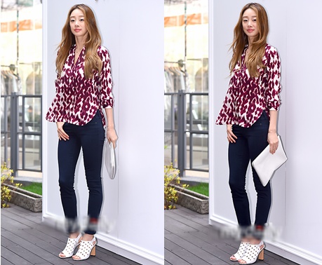 하늘하늘한 블라우스에 스키니 그리고 폴스부띠끄 클러치의 조화가