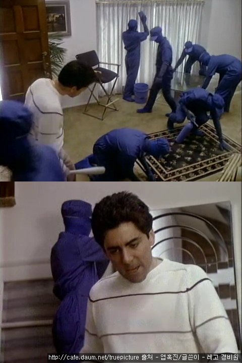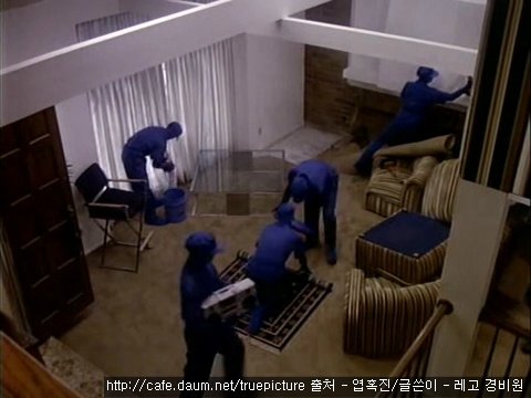 TV, 카펫, 커튼... 손대지 않는 가구가 없는 파란 옷의 사람들...