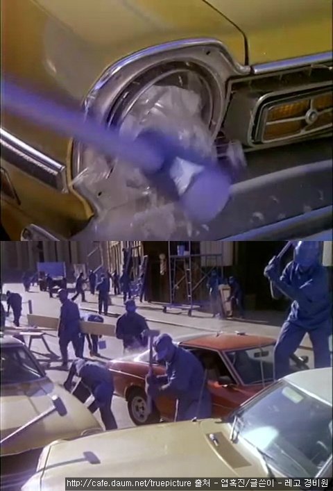 그런 자동차를 일일이 망치로 두드리면서 깨트리고 찌그러트리는 인부들...