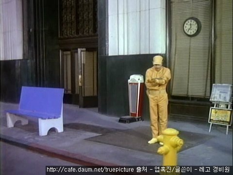 파란 인부들이 여기저기에 전화 부스나 소화전 같은 것을 설치하고