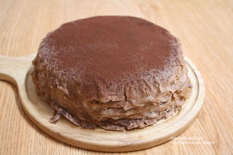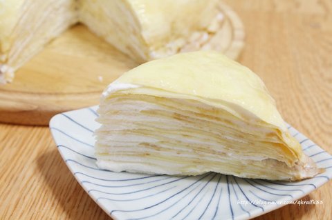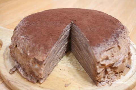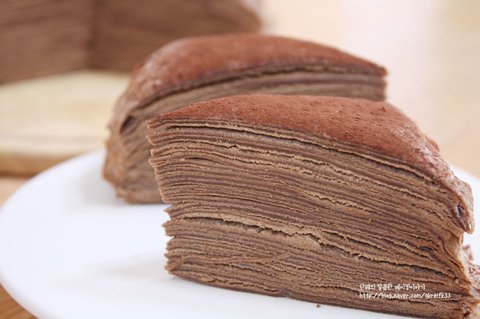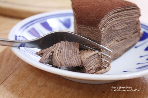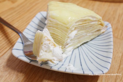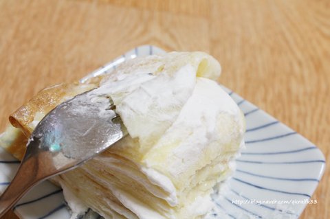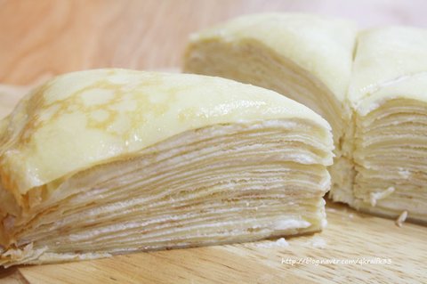 크레이프를 20여장 구워 사이사이 생크림을 바른 부드러운 케이크에요