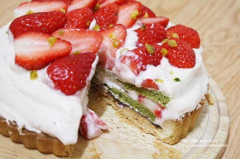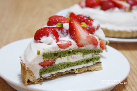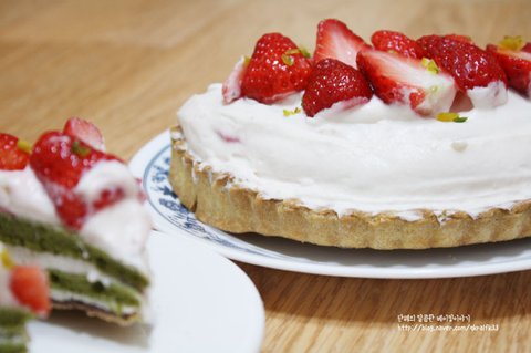 타르트지 위에 초콜릿 코팅을 하고, 딸기무스,녹차비스퀴,무스,딸기로