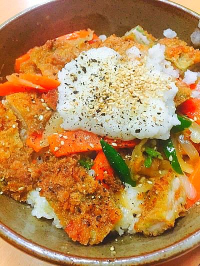 그래도 돈까스가 남았으므로... 가츠동으로 마무리~!! 계란이 없어서 무를 갈아서 얹었습니다.