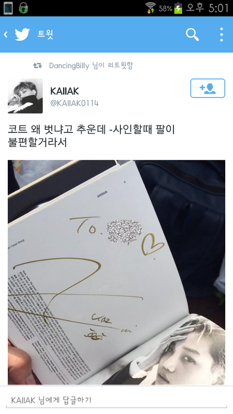 종인이 코트벗고 싸인해 ㅜㅜ