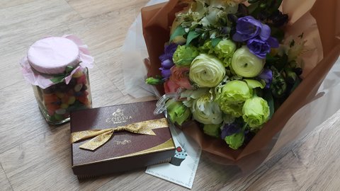 꽃다발과, 제가 좋아하는 고디바 초콜릿, 젤리까지..